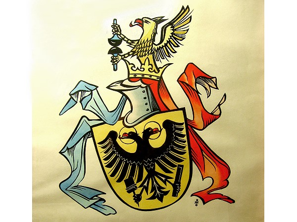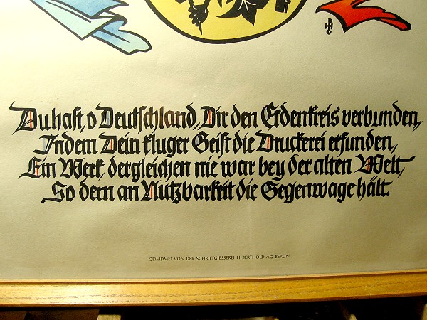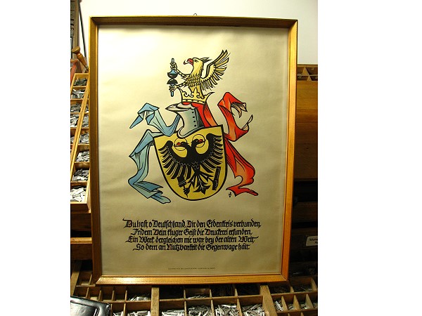 In meiner Werkstatt steht ein gerahmtes Wappen, das ich vor einigen Jahren aus einer Druckerei-Auflösung bekommen habe. Ich müßte es neu rahmen lassen, aufhängen kann man den Rahmen nicht, er fällt fast auseinander. Das Wappen selbst ist aber recht schön gemacht und war einmal ein Geschenk der Schriftgießerei H. Berthold AG Berlin. Das Wappen ist eher ein Berufs- oder Zunftzeichen als ein Wappen.