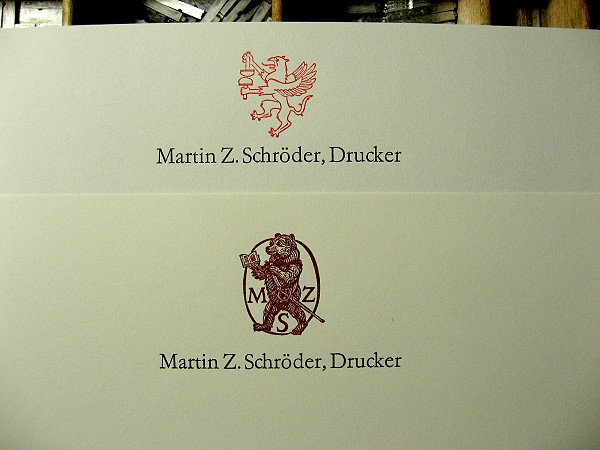 Dieser Image-Wandel berührt mich doch etwas wehmütig. Zwar bin ich entschlossen, mich vom Greifen, dem allgemeinem Druckerwappen, als meinem Firmenzeichen zu verabschieden, aber wenn ich dann so die neuen Drucksachen sehe, merke ich, wie sehr ich mich an ihn gewöhnt habe. Ich meine aber auch, daß der Wechsel richtig ist, weil der Bär, den Hans-Joachim Behrendt für mich in Holz gestochen hat, meiner Werkstatt und meiner Arbeitsweise näher steht. Weil er das Image meiner Werkstatt genauer abbildet (Imago, lat. Bild). Er ist viel weniger schroff und abweisend als der Greif. Herr Petz kommt als freundlicher Zeitgenosse des Weges. Handwerklich ist er viel schöner gearbeitet als der gedruckte Drucker-Greif. Der digitale Greif, den mein Kollege Dieter Keller vor vielen Jahren für mich neu gezeichnet hat, ist zwar besser ausgeführt, er hat an Humor gewonnen, ein wenig Kindlichkeit in den dicken Pfoten und im etwas tapsigen Schritt, aber er kann die Wärme, die Meister Petz mitbringt, nicht ausstrahlen. Herr Greif ist ein recht abstraktes Fabel- und Wappen-Wesen.