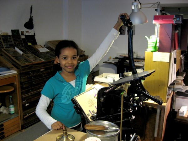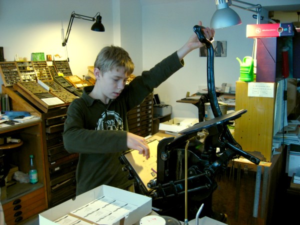 In den Berliner Schulferien wurde der Drucker zum Onkel: Nichten und Neffen kamen zu Besuch. Malwina zum Beispiel, die auf dem Foto mit der Presse auf einem Podest steht, weil einem mit 8 Jahren noch ein paar Zentimeter fehlen, hat sich Briefkarten gedruckt mit der Unger-Fraktur, die sie mühelos liest und als schön verschnörkelte Schrift wahrnimmt, nicht als