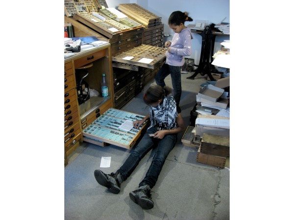 eine absonderliche alte Type. Sie hat mit Redis-, Spitz- und Breitfeder geschrieben, den Cutter ausprobiert (und, von diesem Instrument begeistert, einen Wunsch zum Geburtstag ausgesprochen), Papier geschnitten und am zweiten Tag auch noch Einladungen zum Geburtstag gesetzt, gedruckt und genutet. Eine Druckerei ist eine Schule, Kopfrechnen macht Malwina geradezu Vergnügen.