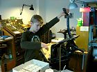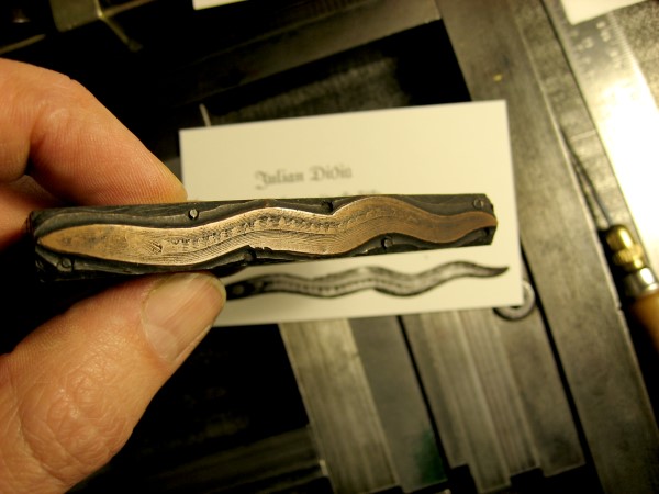 Großen Reiz strahlt der Fundus von Druckstöcken aus. Julian hat sich den schlangenhaften Aal für seine Karte ausgesucht, einen mit Kupfer galvanisierten Metalldruckstock auf einem Holzfuß.
