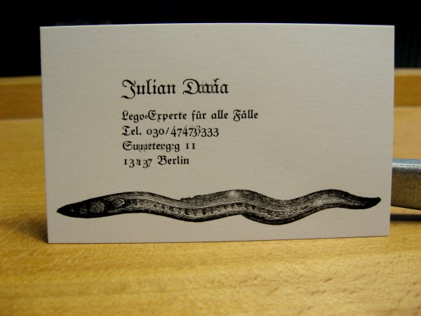 Julian druckte sich ebenfalls aus Fraktur eine Karte als „Lego-Experte für alle Fälle“, was sicherlich ein schöner Beruf ist. Er verglich die Setzerei mit einer Lego-Anlage, wie so alles zu einer Form gefügt werden kann – und die Anzahl der Teile ist keine geringe. Die Unger-Fraktur ist eine besonders nah an der Antiqua gebildete und gut lesbare Schrift,