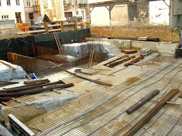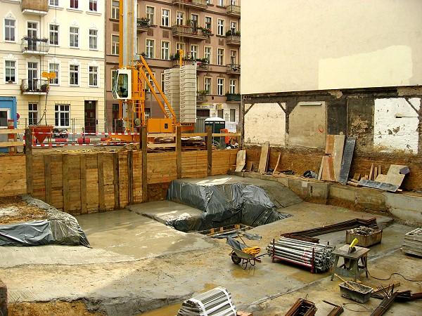 Nachdem die Grube gebuddelt war, kam eine kleine Pause, dann erschienen Kran und mehr Leute, die Container auf die Straße stellten. Und dann kam, was man von Baustellen eben so kennt: Betonmischer (oder heißt das Zement?), Lieferungen von Dingen, deren Namen ich nicht kenne.