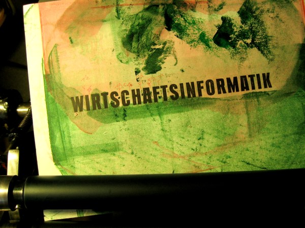 Auf diesem Foto ist Makulatur zu sehen, wie sie gerade Farbe von den Walzen genommen hat. Vielleicht ein hübscher Kommentar zum Zeitgeschehen? Die Druckerey-Wirtschaft ist im Moment allerdings wolkenlos betriebsam, so daß ich im Moment nicht viel Mitteilung davon machen kann. Es fehlt die Zeit.