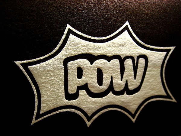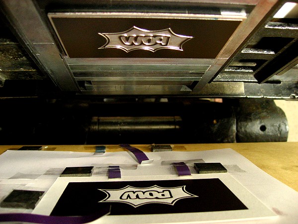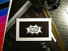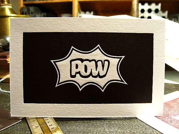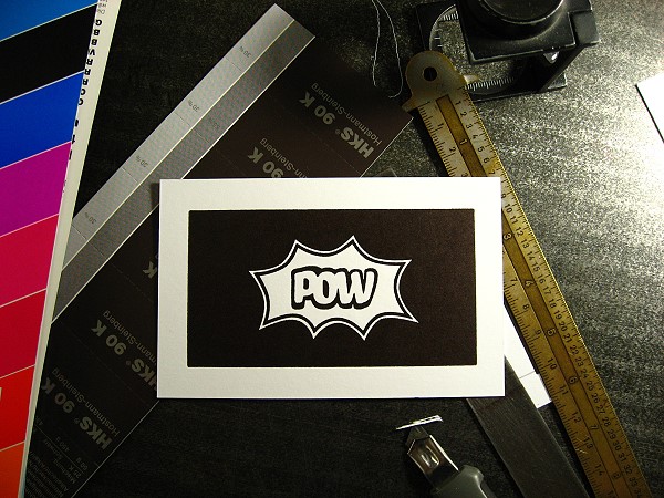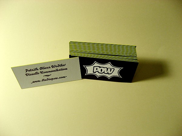 POW wünschte sich Visitenkarten, die auf einer Seite mit einer Farbfläche im Beschnitt bedruckt waren, darin negativ eine Grafik, auf der Rückseite eine digital gesetzte Schrift. Beides war also nicht vom Bleisatz zu drucken, sondern vom Klischee. Die Karten sollten mit einem Farbschnitt ausgestattet werden. Als Farbangaben wurden mir Nummern aus dem HKS-Farbfächer genannt. Ich danke Herrn Wodtke für die freundliche Genehmigung, die von ihm entworfenene, gesetzte und gezeichnete und von mir ausgeführte Arbeit hier zeigen zu dürfen.
