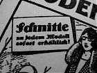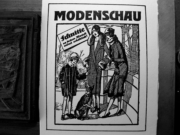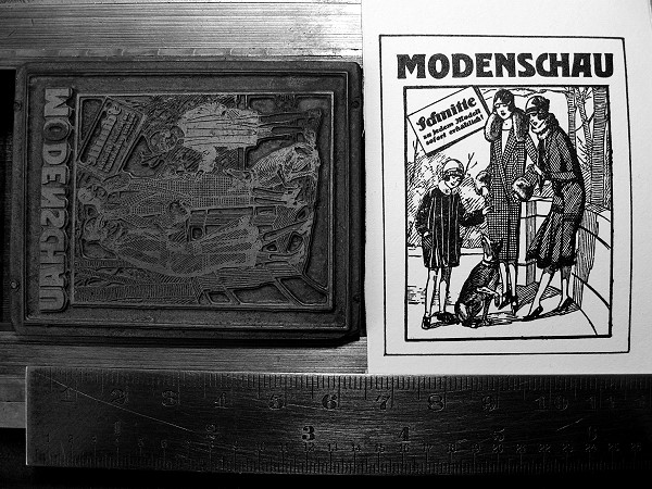 Mein Lieferant für Bleisatzschriften Georg Kraus packt mir gelegentlich Zugaben ein. Diesmal bekam ich ein Klischee, mit dessen Druck vor Jahrzehnten für eine Modenschau geworben wurde. Es ist in einem ausgezeichneten Zustand. Um welches Metall es sich handelt, kann ich nicht erkennen. Es ist hart, hellgrau, kein