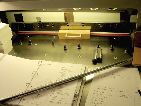 Karton schneiden muß. Das Material Blanc Beige von der Büttenpapierfabrik Gmund ist so empfindlich, daß es ein nicht ganz scharfes Messer übel nimmt. Der Karton ist besonders dicht und schwer, hat also ein sehr hohes Volumen, weil seine hochglatte Oberfläche nicht durch einen Aufstrich, sondern durch Pressung hergestellt wird. Der Messerwechsel ist ein kleiner Kraftakt. Das Messer ist mit acht großen