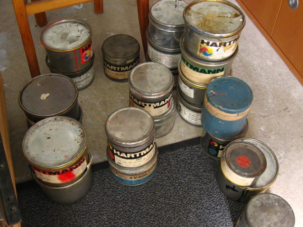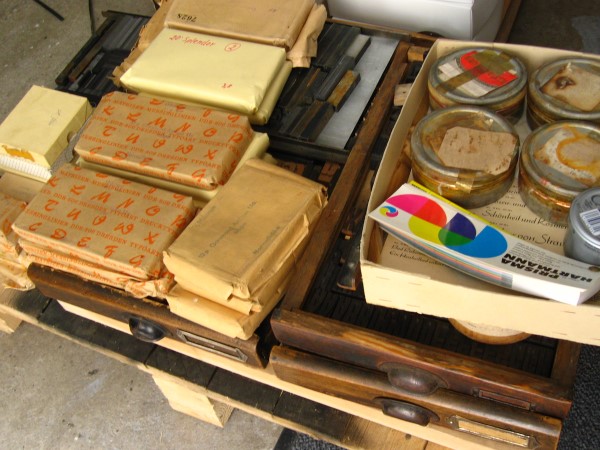 Und gestern war ich stundenlang mit der Übernahme einer kleinen Setzerei beschäftigt. Auf den Fotos mag es für den Laien aussehen wie ein Haufen Krimskrams oder gar Müll. Der Setzer kriegt große Augen, wenn ihm Schriften in Originalverpackung der Gießerei angeboten werden. Ich konnte Reserven für meine Garamond erwerben und einen Berg Kleinmaterial.