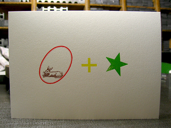 In seinen ersten Osterferien wurde der Knabe von seinem Vater, einem Drucker und Freund meines Hauses, in die Druckerey mitgenommen, um ihm die Schrift im Setzkasten zu zeigen und gemeinsam eine Osterkarte zu drucken. Im Gespräch über Buchstaben ergab sich dieses Bilderrätsel, das dann an zwei Nachmittagen fabriziert wurde. Der Rahmen ist von der Messingform gedruckt, das Plus aus Messinglinien zusammengesetzt, der Stern aus Holz, ebenso der Hase.