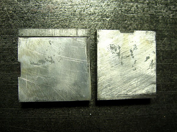 Diese Stücke drucken nicht mit, sie tragen keine Lettern, die sind dazu da, eine Druckform auszustopfen, die druckenden Teile zu umfassen und in der Form festzuhalten. Blindmaterial heißen solche Teile, weil sie im Druck nicht zu sehen sind, sie geben kein Bild. Diese beiden hier sind sogenannte Quadraten. Nicht Quadrate, sondern Quadraten. Der Singular ist allerdings fast unverändert: Quadrat. Allerdings sagen wir nicht das, sondern der Quadrat. Hat mit dem geometrischen nicht viel zu tun, die Seiten der großen Flächen sind nicht gleich lang. Vielleicht deshalb die sprachliche Unterscheidung: der Quadrat, die Quadraten. Und ich finde zwei, die haben einen Buckel. So etwas ist unbrauchbar, denn das Handwerk ist so genau, daß wir Setzer und Drucker mitunter Seidenpapier in die Druckformen einsetzen.