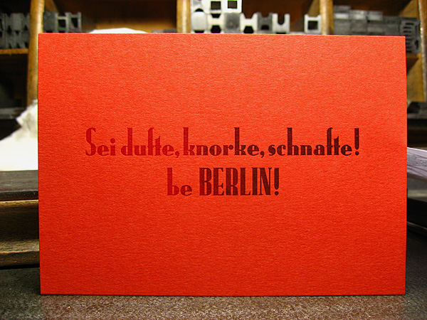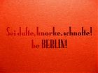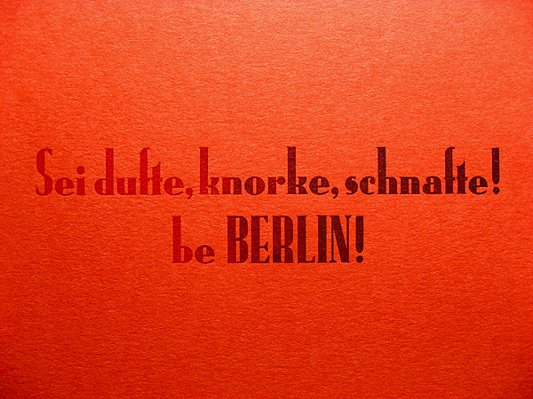 “Be Berlin!” oder “Sei Berlin!” ist ein Reklamespruch für meine Heimatstadt, um den vor einiger Zeit gestritten wurde. Ich finde ihn gar nicht so blöd. So als Appell für angemessenes Benehmen eines Berliners vielleicht etwas albern in seiner sprachlichen Wendung, im Grunde aber doch traditionell an die selbstbewußte Haltung eines Bewohners einer Metropole gemahnend. Aber wenn ich eine solche Karte noch mal drucke, sollte ich vielleicht schnafte gegen schnieke auswechseln. Schnieke, dufte und knorke sollte der Berliner sein. Gibt es dazu eigentlich Substantive? Schniekheit? Duftung? Schnaftizismus? Und Steigerungen? Knorkissimo?