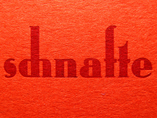 Weil ich die Karte kurz vor dem Waschen der Maschine gedruckt wurde, habe ich von einer Seite etwas dunkle Farbe ins Rot einlaufen lassen. Dieses mehrfarbige Druckverfahren (möglich sind je nach Breite der Druckform mehrere ineinanderfließende Farben nebeneinander) nennt man Irisdruck. Im Heidelberger Tiegel ist er allerdings kaum zu machen, weil das Farbwerk die Druckfarbe seitlich verreibt. Also in sehr kurzer Zeit wird aus dem Farbverlauf ein einziger Farbton. Ist aber nicht schlimm, denn Farbverlauf in der Typografie ist meistens scheußlich. Was nun wiederum nicht ganz unpassend zu dieser Schrift wäre: originell, aber deshalb auch häßlich. Originelle Schriften sind meistens häßlich, fürchte ich, denn gute Schriften sind konventionell, weil sie gelesen werden und die Form der Buchstaben gewissermaßen in Stein gemeißelt ist. Originell aus der Konvention auszubrechen, heißt verzerren, wie hier in der Rundfunk, die wirkt, als habe sie zu lange an ihren Hälsen gehangen. Aber man kann häßliche Schriften angemessen und damit gut einsetzen — also eine alberne Schrift für einen albernen Sinn.