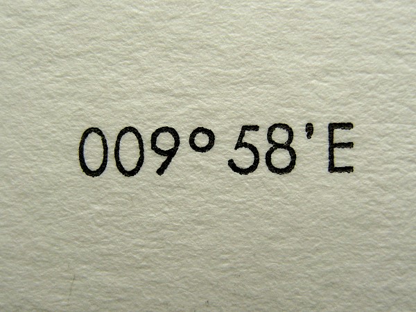 Nicht jedes Schriftzeichen findet der Schriftsetzer in den 125 Fächern des Setzkastens. Für die Visitenkarte eines Nautikers war eine Ortsbestimmung zu setzen, für die ein Gradzeichen benötigt wird. Für das Minutenzeichen läßt sich in der Futura auch das Apostroph einsetzen, aber woher ein Gradzeichen nehmen? Ich habe keinen Kasten für Formelsatz mit entsprechenden Sonderzeichen. Mal hier und mal da findet sich das ein oder andere, aber ein Gradzeichen suchte ich vergeblich. In größeren Schriftgraden könnte man sich mit einer Mediäval-Null oder einem Buchstaben o aus einer geeigneten Schrift behelfen, aber ich hatte die Position aus 8p magerer Futura zu setzen.