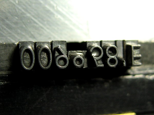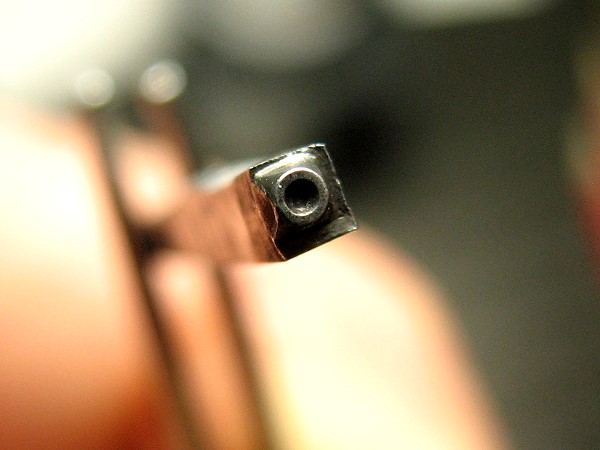 Ich fand einen Kreis, der auf ein Nonpareille-Geviert, also ein 6p-Geviert gegossen war. Der Kreis paßte, aber die Letter, auf der er saß, war zu groß. Also nahm ich erst das Schnitzmesser und dann die Feile.