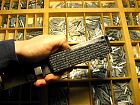 Winkelhaken gibt es in verschiedenen Längen. Ganz handliche für Visitenkarten und sehr lange für Tabellenköpfe. Ich habe inzwischen ein rechtes Sammelsurium, hier mal ein Foto einer Auswahl. Das Ding zum Einstellen der Breite nennen wir Frosch. Winkelhaken sind aus Eisen, Messing oder Aluminium. Ich mag sie alle, wenn sie nur gut in der Hand liegen. Aluminiumwinkelhaken sehen nicht hübsch aus, sind aber angenehm leicht. Eisen muß man öfter putzen und immer ein wenig fetten. Gar nicht im Gebrauch ist der zweite von unten auf dem Foto mit der merkwürdigen Schraube aus Plastik zum Fixieren des Frosches. Nee, Kunststoff mag ich nicht in der Hand halten. Und ganz rechts der kleine ist aus England und untauglich, weil der Frosch federt und die Zeilen immer breiter werden, je voller der Winkelhaken. Das ist nur etwas zum Angucken. Oder für Setzer, die gleichmäßig locker die Zeile ausschließen können (also auf ganze Breite bringen). Ich schließe eher mittelfest aus, so wie ich es als optimal gelernt habe. Ganz oben auf dem Bild ist ein Winkelhaken in Originalverpackung zu sehen. Unbenutzt, noch eingeschweißt und im Originalkarton. Wer den mal einweihen wird? Welche Letter ihn zuerst beziehen wird?