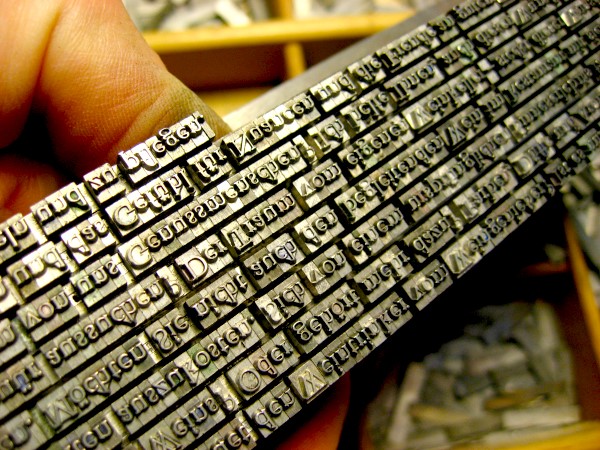 Sind die Entwürfe hinsichtlich Schrift, Druckfarbe, Papier geklärt und wurde das Imprimatur erteilt (Es werde gedruckt!), stelle ich den Satz her. Jede Letter wird einzeln in den Winkelhaken (Metallschiene zum Sammeln der Typen) gesetzt (deshalb: Schriftsetzer) und mit Blindmaterial (das nicht mitdruckt) zur Zeile ausgeschlossen (aufgefüllt).
