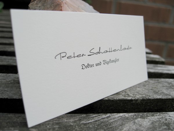 Peter Schottenloër ist eine Persönlichkeit des deutschen Geisteslebens, erscheint gelegentlich als Privatier in meiner Werkstatt und fotografiert und überläßt mir sein Pseudonym, wenn ich mal ein neues Visitenkartenmodell (ist zur Zeit nicht online) entwerfen möchte (Schriften auf nebenstehendem Bild: Elegance und Unger-Fraktur) oder eine Hauptfigur für eine Geschichte zu benamsen habe. Es ist also nicht sein echter Name; Herr Schottenloër meint, er lebe lieber jetzt schon parallel als Geist auf einem Visitenkartenmuster und in einer Geschichte fort, weil er nicht wisse, was später von seiner gegenwärtigen Bekanntheit übrigbleiben werde.