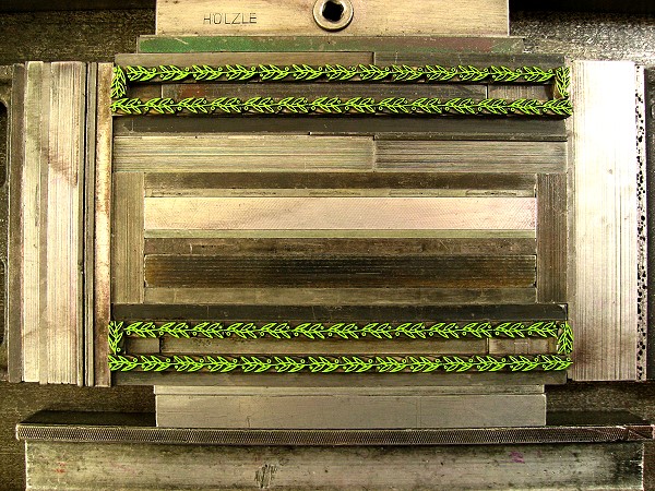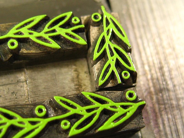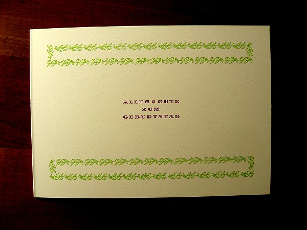 bis mir dämmerte, daß den Fragenden die meisten handelsüblichen Karten mit ihrer schillernden Lärmerei so wenig geeignet zur Gratulation erscheinen wie mir selber und ich nun im Stile meiner Werkstatt eine zurückhaltende freundliche Karte drucken sollte. Gedacht, getan. Hier findet sich die Wirkung meiner Blumenkäufe in den eingesetzten Farben: ein zartes Grün für die floralen Ornamente (deren Herkunfts-Gießerei mir unbekannt ist) und ein kräftiges Violett für die Schrift.