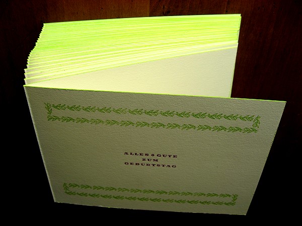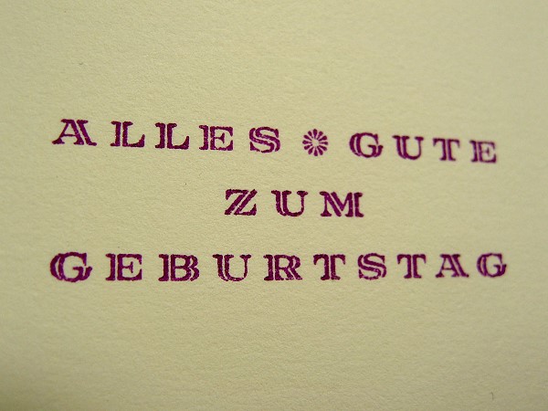 Hier also nun die fertige Geburtstagkarte. Die Schrift heißt Kavalier (und ist digital bislang nicht zu haben). Gedruckt wurde auf einem angenehm weichen Karton aus reiner Baumwolle.