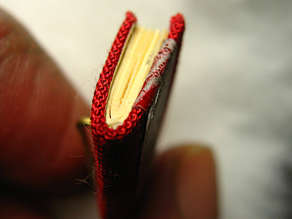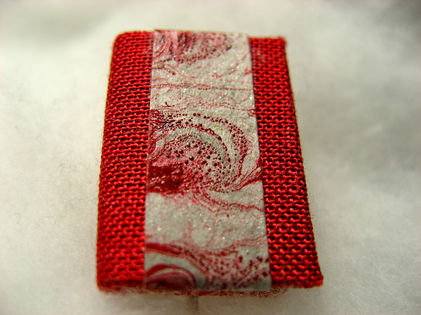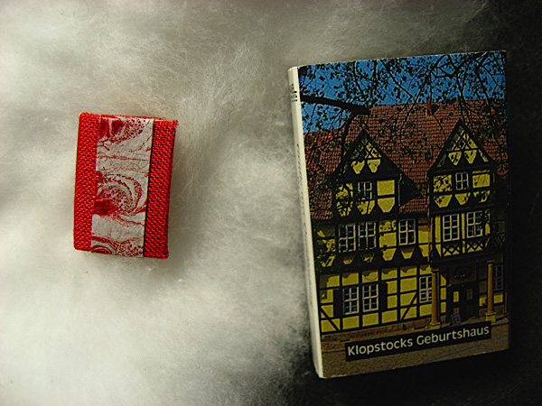 Beispielsweise am 3. August 2010 entdeckte ich hier die Ansteckbüchlein, 15 × 25 mm groß, und bestellte gleich eines. In diesem Beitrag zeigt Heike May den Ohrschmuck, Fingerringe und Manschettenknöpfe mit Büchern, die sie später für den Verkauf präsentierte. Als Manschettenknöpfe scheinen mir die zarten Objekte nicht recht geeignet, denn Ärmel werden doch mehr strapaziert als Ohren. Jedenfalls meine.
