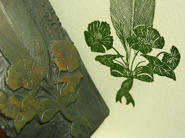 Wenn man sich die Kratzer in den Blüten anschaut, könnte man meinen, daß es sich doch um einen Holzschnitt handelt, oder? Ich kenne mich nicht aus. Ich werde bei Gelegenheit eine Seite anschleifen und nachschauen. Wenn ich vom Holzstich drucke, bin ich jedesmal fasziniert von der filigranen Handarbeit, die in jedem alten Holzstich, den man heute noch findet, ihren Schöpfer überdauert hat.