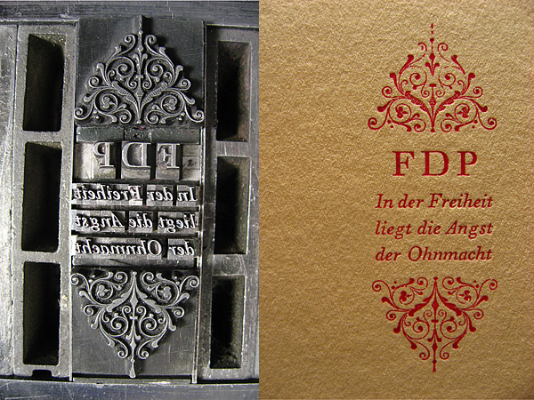 Meine in der Zeitung nur ganz knapp zitierte Anmerkung dazu lautet ungekürzt: Der FDP wünsche ich, daß sie sich löst vom Zwang zum Versprechen individuellen Glücks durch Sicherheit und materielles Vermögen, welches der Staat unserer Tage seinen Bürgern aufdrängt. Die Schrift Walbaum aus der Goethezeit mit passenden Ornamenten und Klärchens Bangen um Egmont sollen die einzige liberale Partei an Risiken und Möglichkeiten der Freiheit erinnern, an die sie nur noch selten denkt. Die FDP darf ruhig etwas pathetischer sprechen und mutiger das Ansehen der Freiheit verteidigen, denn es droht unter die schweren Räder allgemeinen Wohlstandes zu geraten, wie ihn auch Diktatoren als das einzig wahre Glück aller in Aussicht stellen, während sie die Macht der eigenen Kaste meinen.