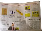 Zwei Ideen der anderen gefallen mir: Erik Spiekermann schafft die drei Buchstaben in einem seiner beiden Vorschläge gleich ganz ab und setzt den Titel der Shakespeare-Komödie “Was ihr wollt” unter das Gelbfeld. Christoph Kunzendorf heftet das tumbe Facebook-Zeichen “Gefällt mir” unter die drei Buchstaben und kommentiert: “Der Facebook-Button verdeutlicht die völlig neue Richtung der FDP und ist Inbegriff für Jugend und Aktualität. Genau wie Dr. Philipp Rösler, der durch seine Kandidatur neue Dynamik in die Partei bringt.” Das Lachen bleibt mir im Halse stecken. So düster ist es um die einzige Partei bestellt, welche die Freiheit überhaupt noch für erwähnenswert ansieht. Wenn sie auch schon viel zu lange nicht mehr darüber redet, was damit gemeint sein könnte.