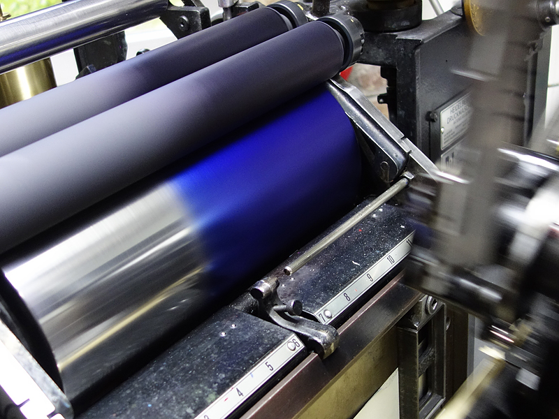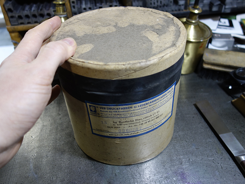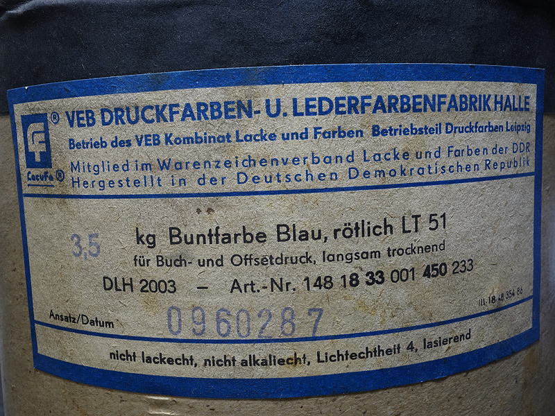 Buchdruckfarben trocknen langsam, damit sie in der langsam laufenden Maschine und im Farbkasten frisch bleiben. Man nennt solche Farben auch »kastenstabil«. Hier eine Farbdose, hergestellt 1987.