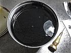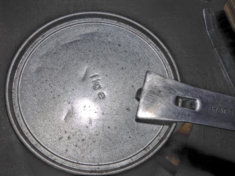 Zum Glück habe ich noch einen Vorrat Buchdruckschwarz. Diese Farbe ist eine sogenannte kastenstabile, sie trocknet nur auf dem Papier, nicht auf den Walzen, nicht im Topf, nicht im Farbkasten der Druckmaschine. Wenn man nun zwei Druckmaschinen hat, kann man in der einen die schwarze Farbe ein paar Tage belassen und druckt alle bunten Farben auf der anderen. Einmal pro Woche muß man die Maschine aber doch waschen, weil sich sonst zuviel Staub aus der Luft in die Farbe einarbeitet. Auf diesem Bild sieht man den angesetzten Farbdosenöffner. Ohne so ein Ding bricht man sich sonst die Finger an diesen Dosen und verbiegt dann auch noch den Deckel.