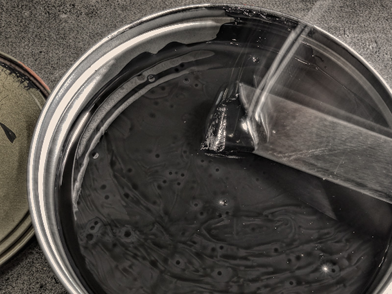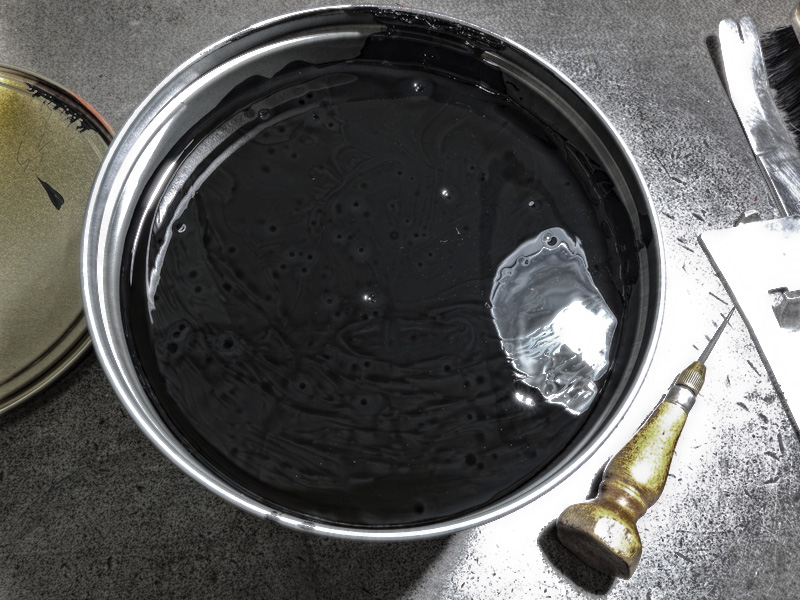 Man nimmt die Farbe mit dem Spachtel immer schön von oben ab und bohrt keine Löcher in die Druckerschwärze. Denn dabei können doch einzelne Klümpchen antrocknen, und dann bekommt man Butzen ins Farbwerk. Wenn sich so ein hartes Korn auf dem Druckstock absetzt, gibt es unschöne Pickel im Druckbild.