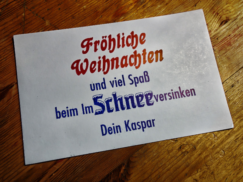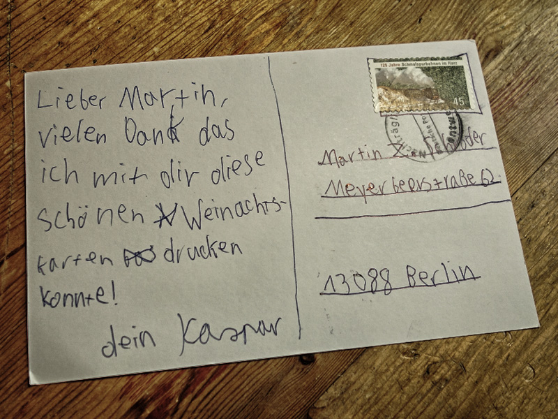 Die Druckerey wird übrigens anno 2014 zwanzig Jahre alt. Wie man an diesen beiden Bildern sieht, erfreut sie sich bei der Jugend einiger Beliebtheit; genannter Kaspar, zehn oder elf Jahre alt, hat sie im Herbst gesetzt und gedruckt und mir nun diese mit freundlichen Worten zukommen lassen.