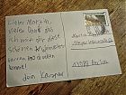 Martin Z. Schröder: Mit der Post kommen drei Briefe von der Telekom. Einer enthält eine Art Begrüßung zum dem seit heute toten Anschluss, den ich angeblich am 27. 9. beauftragt habe und mit dem ich von Mitte September bis heute telefonieren konnte. Einer enthält eine Telefonkarte zu einem Stick, den ich nie bekommen habe und der dritte begrüßt mich als Kunden der Telekom für den Stick, den ich nicht bekommen habe. Ich danke sehr herzlich für diese viele liebe Post und sende auf diesem Wege recht herzliche Grüße zurück.