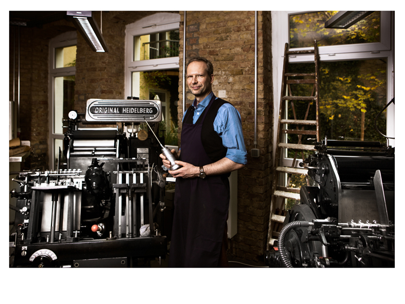 Der Fotograf Jan Hinkel hat Ende letzten Jahres Bilder in meiner Werkstatt für eine Serie über traditionelles Handwerk gemacht und mir gestattet, das mich zwischen meinen Druckpressen zeigende hier abzubilden. Die auf dem Bild linke Maschine ist meine erste Presse, die jünger ist als ich: Baujahr 1969.