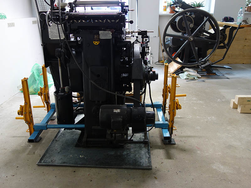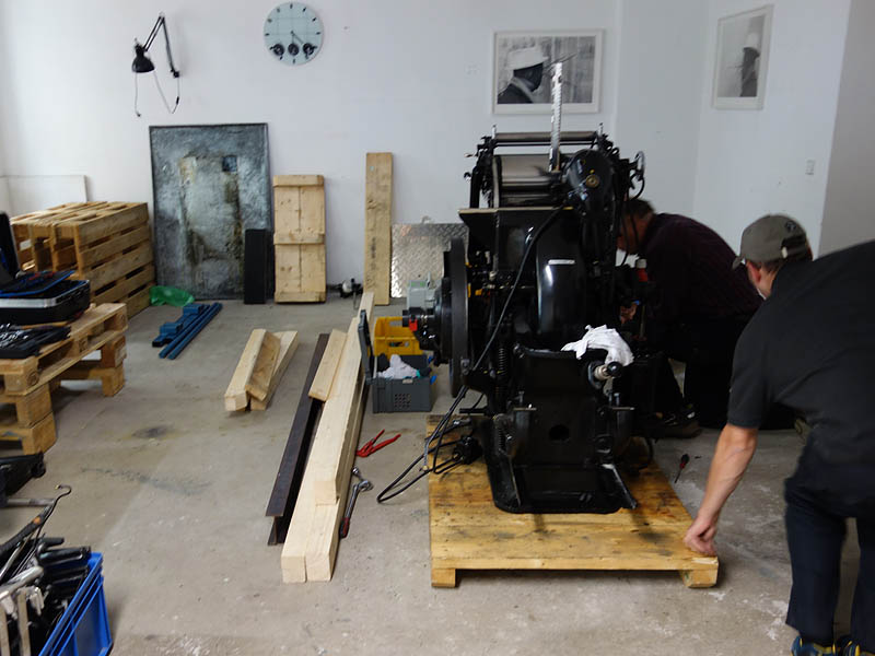 Langsam wird die Woche zu lang. Es ist ein harter Brocken, dieser Umzug, und ich bin froh, wenn nach dem fünften Tag die Maschinen stehen. Und ich hoffe, es geht alles gut. Auf diesem Foto sieht man den Heidelberger Tiegel, das heißt, seine Basis, auf der Palette stehen.