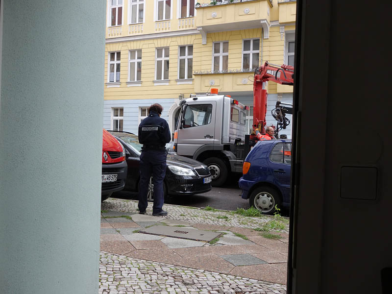 Derweil rief ich die Polizei an. Das Ordnungsamt erschien und ließ drei Autos umsetzen. Die Rücksichtslosigkeit ist in Pankow deutlich größer als in Weißensee, wo sich bislang niemand in den Weg stellte. Die Dame vom Ordnungsamt meinte, in Prenzlauer Berg sei es noch schlimmer. Das Umsetzen koste den Fahrzeughalter 180 Euro – offenbar keine abschreckende Gebühr.