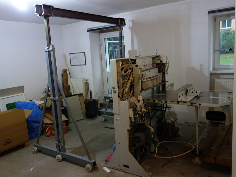 Die erste Maschine steht im Drucksaal. Dazu der Tisch der Schneidemaschine. Am heutigen fünften Tag sollen alle Maschinen eingebracht, aufgebaut und betriebsbereit gemacht werden.