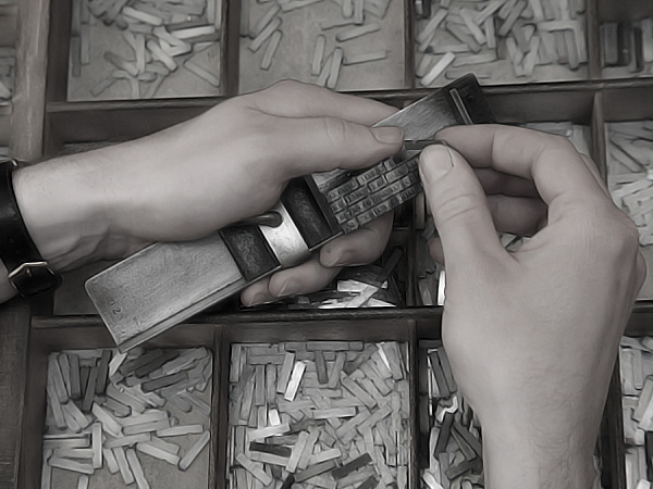 Zwischen einem Setzerkollegen und mir entspann sich ein Gespräch darüber, wie man den Winkelhaken richtig hält. Der Kollege meinte, nachdem er mich im Film hatte setzen sehen, der Winkelhaken sollte richtigerweise wohl über dem Handgelenk und in der Verlängerung auf dem Unterarm liegen.