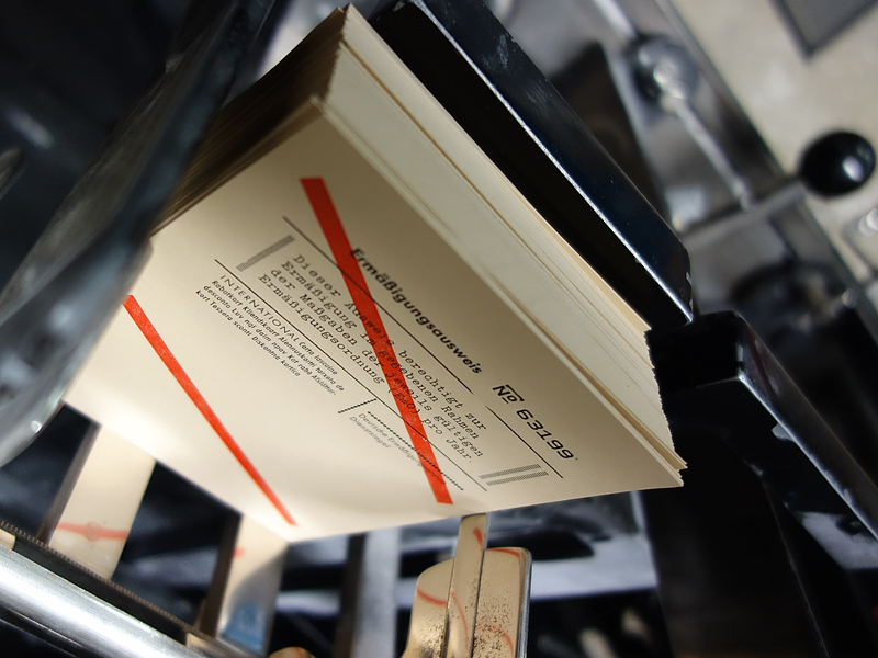 Auf Wunsch des Zeichners und Comicduomitglieds Elias Hauck von Hauck & Bauer fabriziere ich dieser Tage einen Ausweis, der überall eingesetzt werden kann, wo es etwas zu erschleichen gibt. Das Dokument von der Deutschen Ermäßigungsanstalt wird im Handsatz hergestellt, die vielsprachige Kurzübersetzung links unten ist gesetzt aus schmalmagerer Futura in Nonpareille (6 Punkt), das Dienstsiegelfeld aus magerer Futura in Nonpareille, der Haupttext aus Schreibmaschinenschrift in Petit (8p) und die Überschrift aus dreiviertelfetter Futura in Korpus (10p), die dem Desktop-Schriftsetzer übrigens immer noch nicht zur Verfügung steht.