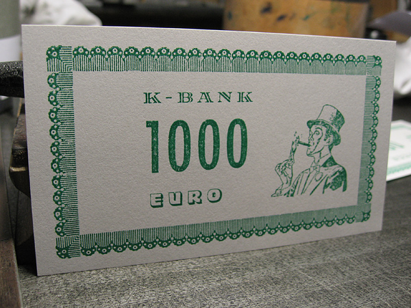 Der Chefbankier hat die Bank nach sich selbst benannt, deshalb heißt sie K-Bank. Wechselgeld hat der Neunjährige nicht drucken wollen, sondern sich an einem hübschen Bündel erfreut, das er auf dem Handtiegel gedruckt hat.