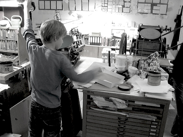 Hier nun also die ersten Bilder von der fertigen Arbeit. Sechs Monate hat es gedauert. In meiner Werkstatt haben wir zu zweit gesetzt und gedruckt. In Hamburg haben Erich Hirsch und Helmut Bohlmann Monotype-Satz angefertigt. In Niederkassel am Rhein hat Thomas Kersting Linotype-Satz hergestellt. Aus Italien kam das Papier für die Umschläge von Fedrigoni, und das von Arjowiggins hergestellte Papier lieferte die in Hamburg ansässige Papier-Union. Herbert Wrede in Bremen half mir bei einer Havarie des Heidelberger Tiegels aus der Patsche. Der Kurier Wieland Gähde brachte mich mit den vielen Kisten und Paketen sicher zur Buchbinderei Penkwitz. In der Buchbinderei Penkwitz in Berlin-Kreuzberg wurde von zwei Buchbindern gefalzt und geschnitten. Bei Lüderitz & Bauer saß Herr Bruckmann an der Fadenknotenheftmaschine, und flinke Buchbinderinnenhände legten Umschläge um und schlugen die Büchlein in Packpapier ein. Ich sage allen Zuträgern Dank. Es war wunderbar. Ich bin froh, daß die Arbeit fertig ist.