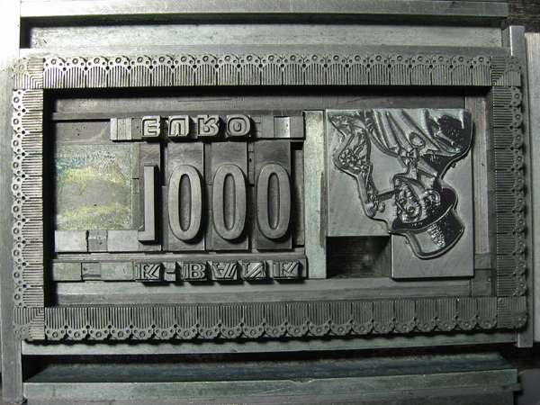 Hier ist die ganze Druckform zu sehen (die Ziffern sind aus schmalhalbfetter Futura gesetzt). In zwei Stunden wurden etwa fünfzigtausend Euro produziert. (Natürlich wird das Bargeld nicht in der Werkstatt gelagert.)