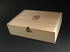 Für Briefkarten habe ich eine einfache Holzschatulle bauen lassen. Der Kasten ist aus Buchenholz mit Fingerzinken gebaut und wurde mit einem Deckel aus Okoumé-Sperrholz ausgestattet, wie er auch für Zigarrenkisten verwendet wird. Das rohe Holz ist feingeschliffen und weder lackiert noch geölt, es bräunt bei Alterung nach und hat eine geringe Maserung. Der Einfalldeckel ist mit einem Scharnier befestigt und hat einen Klappverschluß. Die Brandprägung zeigt die von Hans-Joachim Behrendt in Schabtechnik gezeichnete Druckermarke des Berliner Druckers.